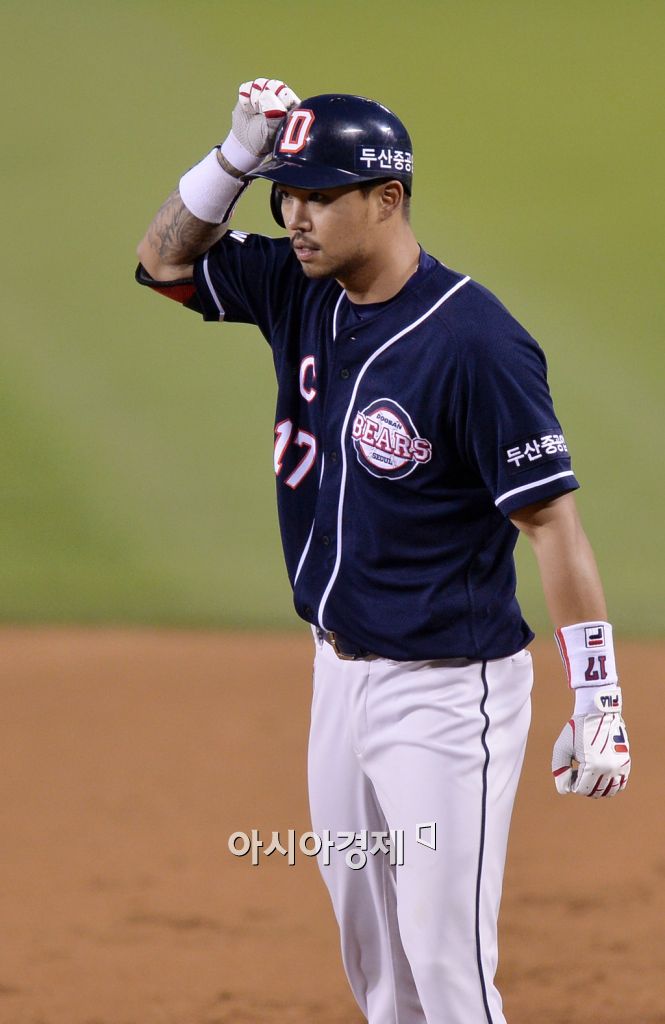 [잠실=아시아경제 김현민 기자] 2015 KBO리그 두산 베어스와 LG 트윈스의 경기가 9일 잠실야구장에서 열렸다. 4회초 2사 1,3루에서 두산 오재원이 추가 1타점 적시타를 치고 더그아웃을 향해 세리머니하고 있다. 김현민 기자 kimhyun81@asiae.co.kr<ⓒ세계를 보는 창 경제를 보는 눈, 아시아경제(www.asiae.co.kr) 무단전재 배포금지>