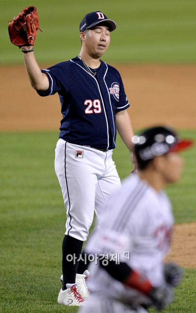 [잠실=아시아경제 김현민 기자] 2015 KBO리그 두산 베어스와 LG 트윈스의 경기가 9일 잠실야구장에서 열렸다. 두산 선발 유희관이 4회말 1사 1루에서 LG 유강남에게 볼넷을 허용하고 있다. 김현민 기자 kimhyun81@asiae.co.kr<ⓒ세계를 보는 창 경제를 보는 눈, 아시아경제(www.asiae.co.kr) 무단전재 배포금지>