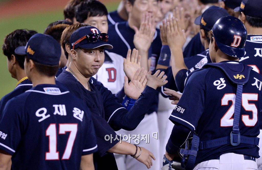 [잠실=아시아경제 김현민 기자] 2015 KBO리그 두산 베어스와 LG 트윈스의 경기가 9일 잠실야구장에서 열렸다. 5.2이닝 1실점 호투로 시즌 8승째를 따낸 두산 선발 유희관이 팀의 5-2로 승리를 확정한 뒤 동료들과 기뻐하고 있다. 김현민 기자 kimhyun81@asiae.co.kr<ⓒ세계를 보는 창 경제를 보는 눈, 아시아경제(www.asiae.co.kr) 무단전재 배포금지>