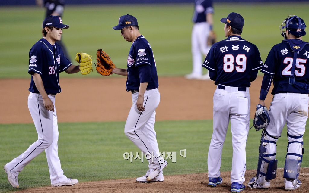 [잠실=아시아경제 김현민 기자] 2015 KBO리그 두산 베어스와 LG 트윈스의 경기가 9일 잠실야구장에서 열렸다. 9회말 1사에서 두산 투수 이현승이 노경은과 교체되고 역투하고 있다. 김현민 기자 kimhyun81@asiae.co.kr<ⓒ세계를 보는 창 경제를 보는 눈, 아시아경제(www.asiae.co.kr) 무단전재 배포금지>
