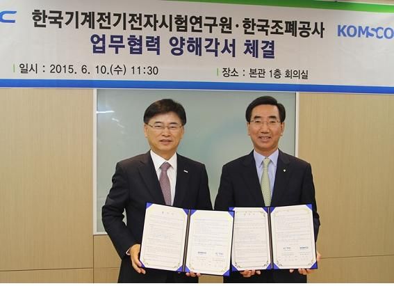 김화동(왼쪽) 한국조폐공사 사장과 최갑홍 한국기계전기전자시험연구원장이 업무협약서를 펼쳐보이고 있다.