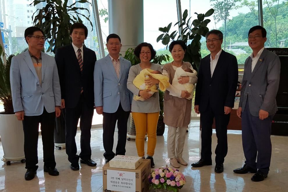 [박종학 삼향읍장이 3만번째 남악주민인 쌍둥이 형제와 부모를 초대해 축하 꽃다발과 기념 선물을 전달한 뒤 기념촬영을 했다.]<br />