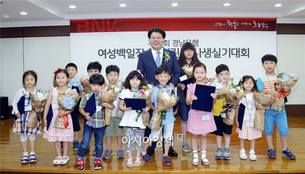 손교덕 경남은행장(가운데)이 제25회 여성백일장 및 어린이사생실기대회 수상자들과 기념촬영을 하고 있다.(자료:경남은행)