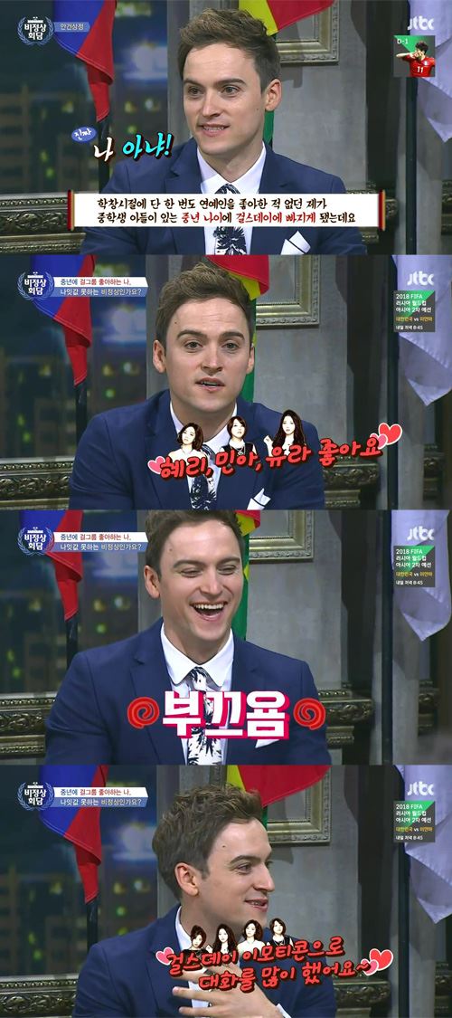 [아시아경제 온라인이슈팀] '비정상회담' 캐나다 대표 기욤이 걸그룹 걸스데이의 팬이라고 밝혔다. 15일 방송된 JTBC 예능 '국경 없는 청년회-비정상회담'에는 배우 조민기가 출연해 '중년에 걸그룹을 좋아하는 나, 나잇값 못하는 비정상인가?'라는 시청자 안건을 상정했다. 이날 조민기는 "걸스데이를 좋아하는 남학생이 아닌 아저씨다. 학창시절에 단 한 번도 연예인을 좋아한 적 없던 내가 중년 나이에 걸스데이에 빠지게 됐다"고 시청자의 안건을 소개했다. 이어 "팬으로서 단순히 노래나 방송 활동만 지켜보다 최근엔 공연까지 찾아가 응원하기 시작했는데, 가족들이 나의 순수한 팬심을 이해하지 못하고 '주책바가지다' '나잇값 못 한다'며 맹비난을 퍼붓고 있다"고 시청자의 고민을 설명했다. 이에 샘 오취리는 "혹시 이거 기욤의 안건 아니냐. 기욤이 걸스데이를 정말 좋아한다"고 의심의 눈초리를 보냈고, 기욤은 "걸스데이를 좋아한다. 혜리, 민아, 유라가 좋다"고 애정을 드러냈다. 그러자 타쿠야는 "기욤과 메신저를 하면 걸스데이 이모티콘이 날아온다"고 말했고, 기욤은 "메신저에서 걸스데이 이모티콘으로 대화를 많이 했다"고 인정해 웃음을 자아냈다.온라인이슈팀 issue@asiae.co.kr<ⓒ세계를 보는 창 경제를 보는 눈, 아시아경제(www.asiae.co.kr) 무단전재 배포금지>