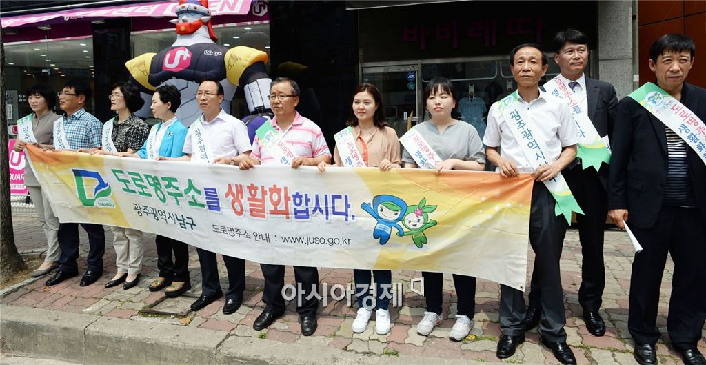 광주 남구(구청장 최영호) 박종채 민원봉사과장을 비롯한 민원봉사과 직원, 한국공인중개사협회 광주남구지회 회원 30여 명은 16일 봉선동 쌍용아파트 사거리 일원에서 생활속 매니페스토 실천 및 도로명주소 정착을 위한 거리 홍보 캠페인을 펼쳤다. 사진제공=광주시 남구<br />