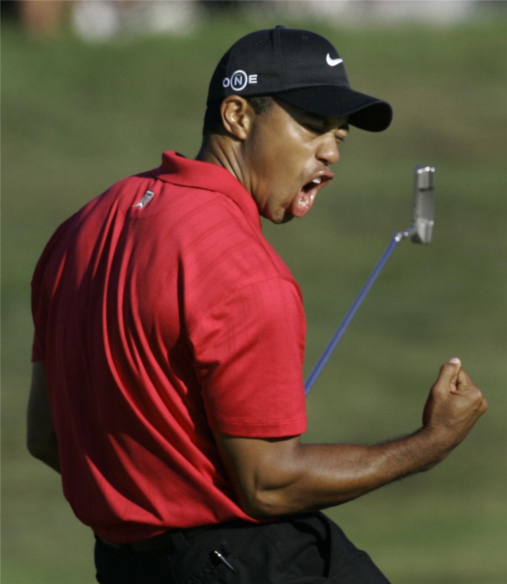 타이거 우즈가 2008년 US오픈 당시 18홀 연장전에 이어 서드데스까지 '91홀 사투' 끝에 우승을 확정하는 순간 포효하는 모습.