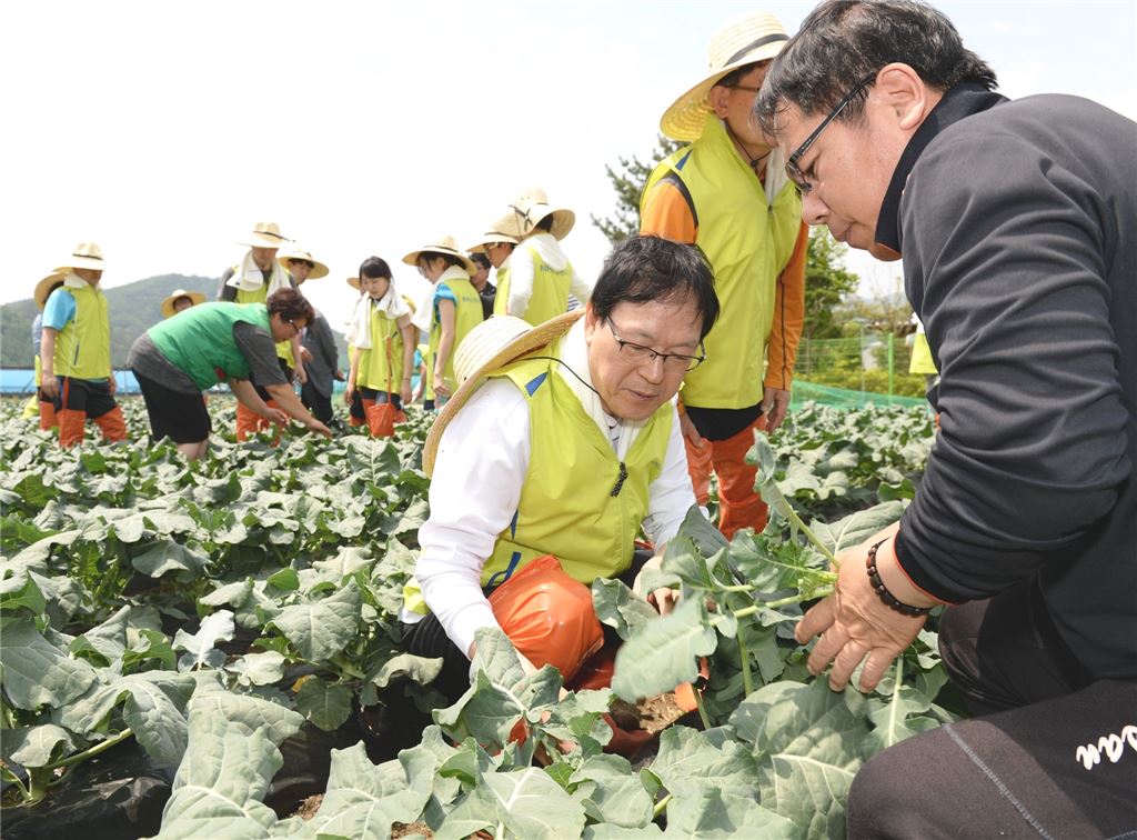 김용환(가운데) NH농협금융지주 회장과 임직원 봉사단이 지난달 14일 강원도 홍천 동면 왕대추 마을에서 농촌 일손돕기를 하고 있다.