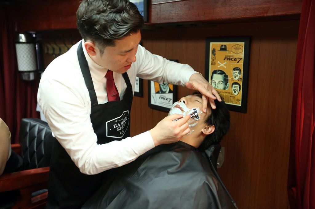 도루코의 '특별한 바버샵 버스' 첫 번째 당첨자인 권경락씨(35)까 바버 서비스를 받고 있다.