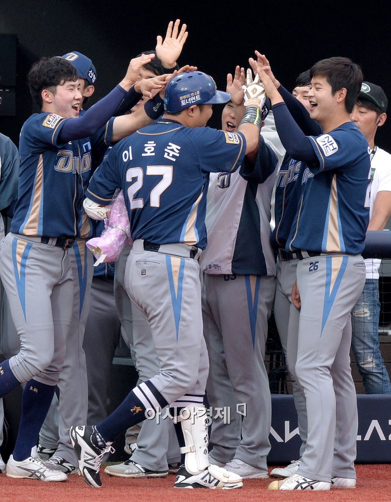 [수원=아시아경제 김현민 기자] 2015 KBO리그 NC 다이노스와 kt 위즈의 경기가 18일 수원야구장에서 열렸다. NC 이호준이 1회초 무사 2루에서 kt 선발 정성곤을 상대로 추가 투런 홈런을 치고 동료들의 열렬한 환영을 받고 있다. 이호준은 이 홈런으로 통산 300 홈런을 달성했다.김현민 기자 kimhyun81@asiae.co.kr<ⓒ세계를 보는 창 경제를 보는 눈, 아시아경제(www.asiae.co.kr) 무단전재 배포금지>