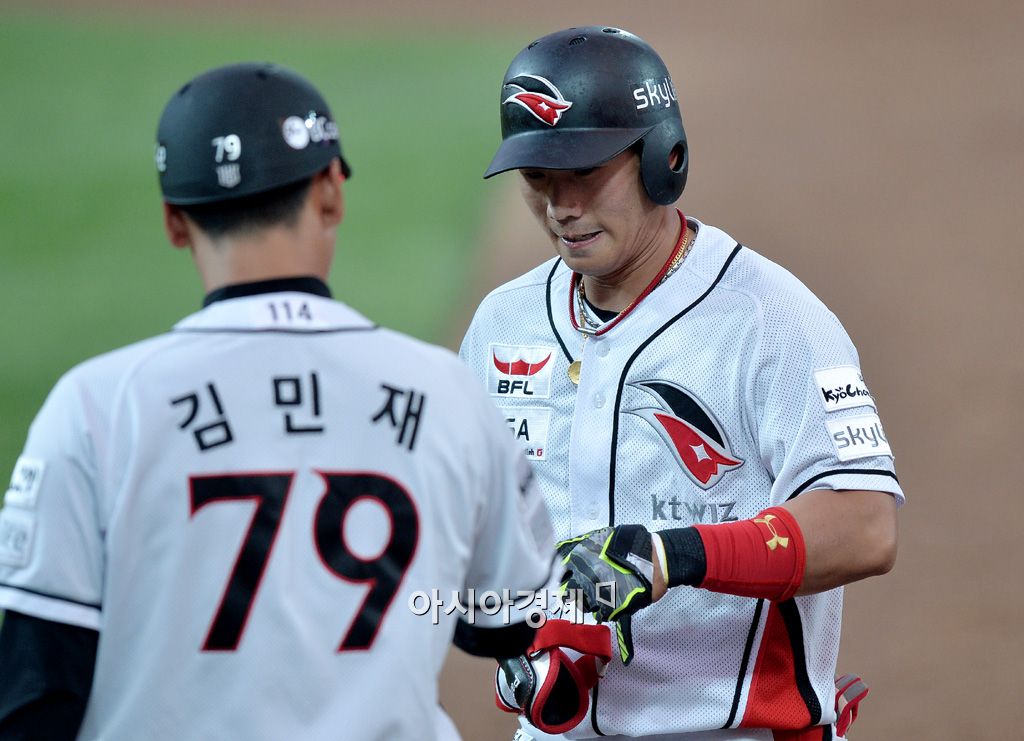 [수원=아시아경제 김현민 기자] 2015 KBO리그 NC 다이노스와 kt 위즈의 경기가 18일 수원야구장에서 열렸다. 3회말 kt 선두타자 박경수가 중견수 옆 안타를 치고 김민재 코치와 하이파이브하고 있다.김현민 기자 kimhyun81@asiae.co.kr<ⓒ세계를 보는 창 경제를 보는 눈, 아시아경제(www.asiae.co.kr) 무단전재 배포금지>