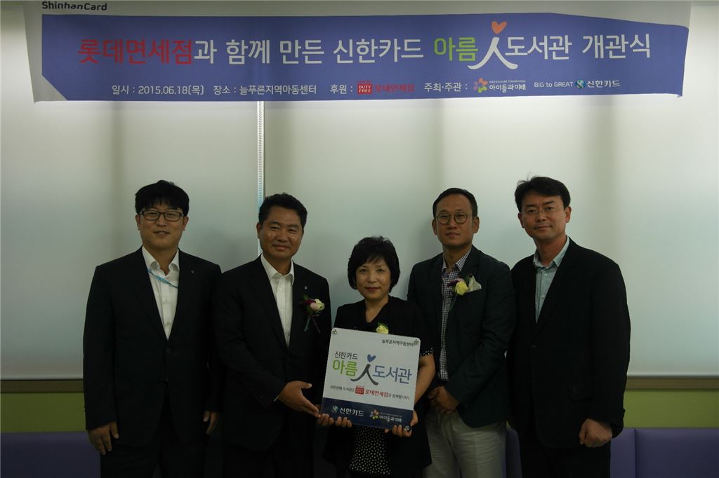 ▲배연태 신한카드 제휴영업본부장(왼쪽 두번째), 방순양 제주 늘푸른지역아동센터 센터장(가운데) 및 김원식 롯데면세점 마케팅팀장(왼쪽 네번째)이 개관 기념 사진을 찍고있다.