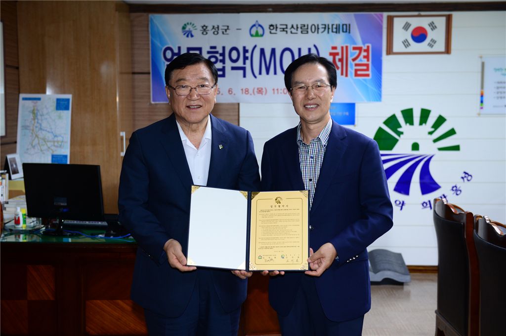 조연환(오른쪽) 한국산림아카데미 이사장과 김석환 홍성군수가 협약서를 펼쳐보이고 있다.