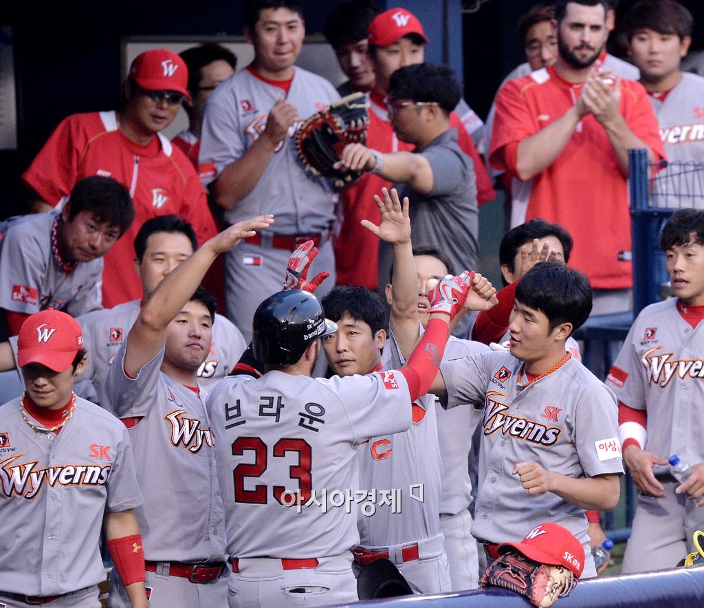 [잠실=아시아경제 김현민 기자] 2015 KBO리그 SK 와이번스와 두산 베어스의 경기가 23일 잠실야구장에서 열렸다. 4회초 SK 선두타자 브라운이 두산 선발 장원준을 상대로 좌월 솔로 홈런을 치고 동료들의 환영을 받고 있다. 김현민 기자 kimhyun81@asiae.co.kr<ⓒ세계를 보는 창 경제를 보는 눈, 아시아경제(www.asiae.co.kr) 무단전재 배포금지>