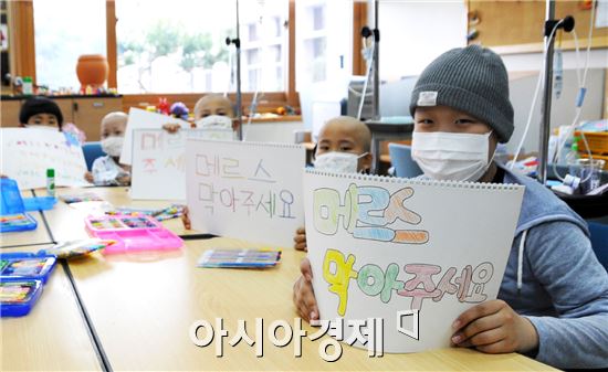 소아암을 치료받고 있는 화순전남대병원 ‘여미사랑병원학교’ 환아들이 메르스를 꼭 막아달라는 소망을 적은 글을 들어보이고 있다.
