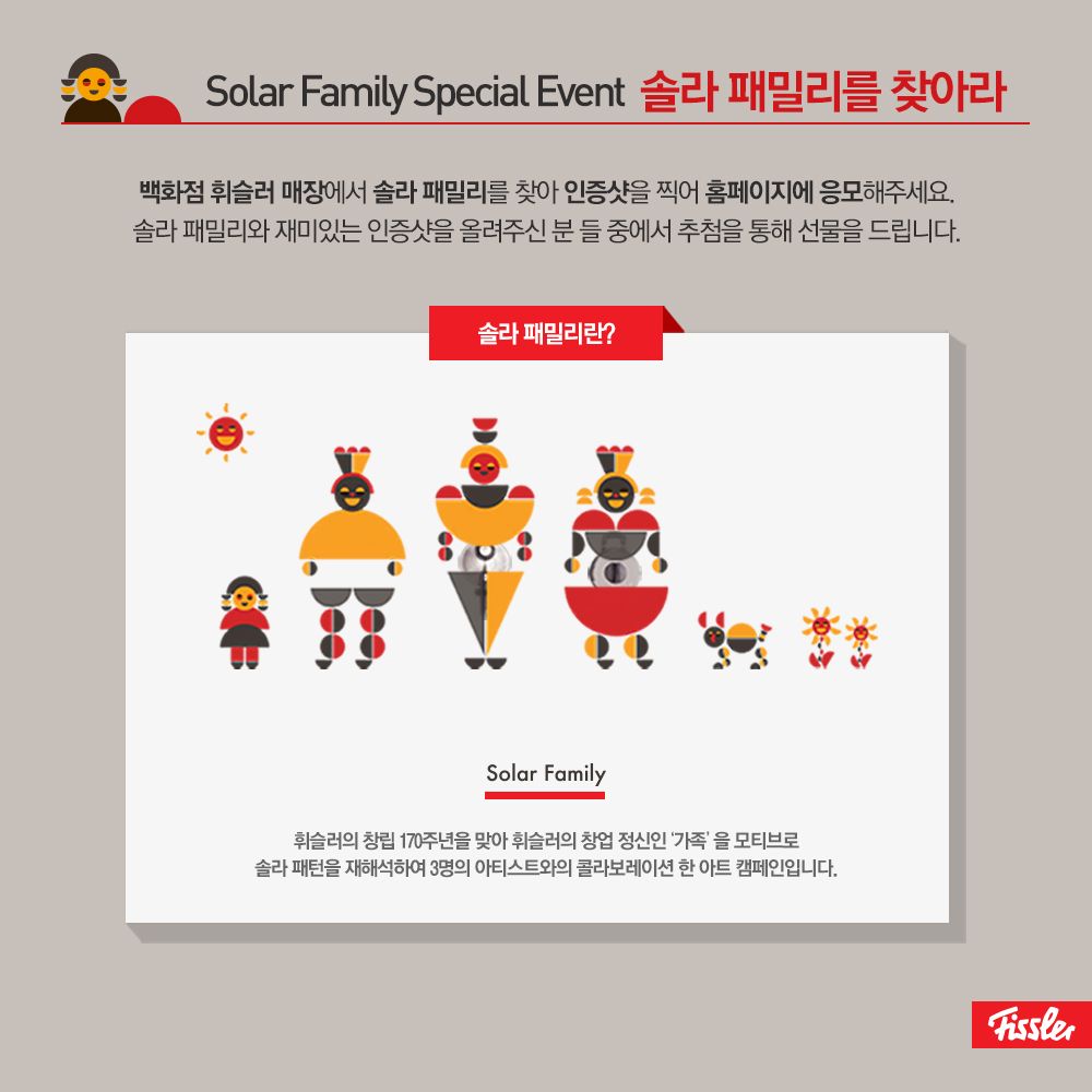 [아시아경제 조강욱 기자] 휘슬러코리아는 창립 170주년을 기념해 '솔라 패밀리를 찾아라' 이벤트를 진행한다고 26일 밝혔다.휘슬러의 '솔라 패밀리'는 창립 170주년을 맞아 휘슬러의 창업 정신인 '가족'을 모티브로 하고, 휘슬러 고유의 솔라 패턴을 재해석하여 3명의 아티스트와 콜라보레이션을 진행한 아트 캠페인이다.'솔라 패밀리를 찾아라' 이벤트는 전국 백화점 내 휘슬러 매장에서 솔라 패밀리를 활용해 재미있고 참신한 사진을 찍어 휘슬러코리아 공식 홈페이지를 통해 응모하면 된다. 추첨을 통해 1등 1명에게는 700만원 상당의 휘슬러 제품으로 구성된 '휘슬러 드림 키친'을, 2등 3명에게는 신라호텔 더 파크뷰 뷔페 2인 식사권을, 3등 170명에게는 스타벅스 아메리카노 교환권을 제공한다. 이번 이벤트는 6월 26일에서 7월 19일까지 진행되며, 당첨자는 7월 29일에 발표한다.휘슬러코리아 커뮤니케이션 담당 이진실 매니저는 "휘슬러 170주년을 기념하는 온-오프라인 연계 이벤트를 통해 소비자들이 휘슬러 170주년 기념 아트 캠페인 '솔라 패밀리'를 유쾌하게 만날 수 있는 기회를 만들고 싶었다"며 "향후에도 아트 마케팅과 연계해 소비자들에게 혜택을 제공할 수 있는 다양한 이벤트를 이어갈 예정이다"고 밝혔다. 한편 휘슬러는 창립 170주년을 기념한 아트 캠페인 '솔라 패밀리'를 시작으로 '휘슬러 인 판타지(Fissler in fantasy)' 라는 큰 주제하에 다양한 아트 마케팅을 선보이고 있으며, 그 첫번째로 휘슬러코리아 공식 홈페이지를 통해 솔라 패밀리 헤리티지 영상을 공개했다. 또한 '주방'을 세련된 문화 예술 콘텐츠로 재해석하고 오감을 통해 작품을 체험할 수 있는 전시회 '키친 인 판타지(KITCHEN IN FANTASY)'를 개최했으며 앞으로도 휘슬러코리아만의 독창적인 아트 마케팅을 꾸준히 펼칠 예정이다. 조강욱 기자 jomarok@asiae.co.kr<ⓒ세계를 보는 창 경제를 보는 눈, 아시아경제(www.asiae.co.kr) 무단전재 배포금지>조강욱 기자 jomarok@asiae.co.kr<ⓒ아시아 대표 석간 '아시아경제' (www.newsva.co.kr) 무단전재 배포금지>
