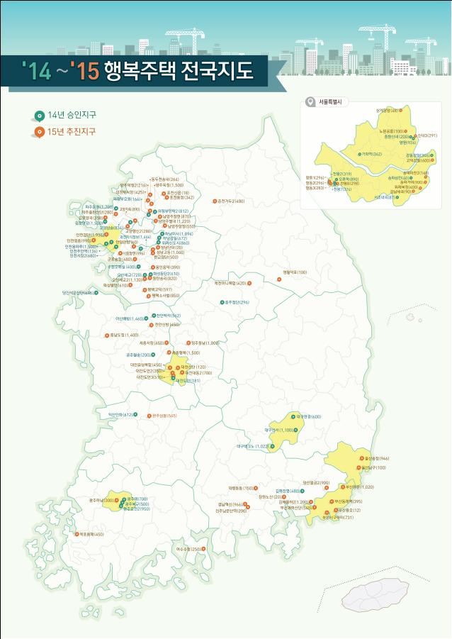 [아시아경제 주상돈 기자] 3만8000가구 규모의 행복주택 입지 70곳이 추가로 확정됐다. 국토교통부는 연말까지 이 물량에 대한 사업승인을 마치고 2만가구 이상을 착공할 방침이다.28일 국토부는 지난 6개월간 젊은 층 수요와 대중교통 편리성 등 행복주택 취지에 부합하는 부지에 대해 지자체 협의, 민관합동 '입지선정협의회' 검증절차 등을 거쳐 3만8000가구 입지로 70곳을 선별·확정했다고 밝혔다.김경환 국토부 제1차관은 "지난해 주택사업승인 물량인 2만6000호(37곳)를 포함하면 현재 총 6만4000호(107곳)의 사업이 진행되고 있다"며 "현재 정부목표인 14만가구의 절반에 육박하는 사업이 진행되고 있어 사실상 행복주택 사업이 본 궤도에 올랐음을 의미한다"고 말했다.행복주택 사업은 정부와 지자체, 공기업간 다양한 협업을 통해 진행된다. 정부는 행복주택 건설비 및 국공립어린이집 등 지역주민편의시설 설치비 지원과 한국토지주택공사(LH) 시행분에 대한 사업승인을 한다. 지자체는 사업계획 협의와 지방공사 시행분에 대한 사업승인을, LH·철도시설공단·지방공사 등은 행복주택 계획과 건설 및 운영을 하는 식이다.안양 관양지구의 경우 경기도시공사가 국유지인 철도부지에 행복주택 60가구를 건설·운영한다. 경기도는 사업승인을, 안양시는 행복주택과 연계해 주차시설 및 주민커뮤니티시설 확충 등의 주변 도시재생사업을 시행한다. 또 부산 아미지구의 경우 부산도시공사가 주거환경개선지구에 행복주택 731호를 건설·운영하고, 부산시와 서구청은 정비구역지정과 사업승인을 하게 된다.김 차관은 "지자체나 지방공사가 행복주택 사업을 직접 시행하는 사례가 지난해 7곳 2500가구에서 올해 27곳 7300가구로 증가했다"며 "이처럼 지자체 등이 해당 지역의 주거복지 사업을 직접 추진하기 위해 적극적으로 나선 것은 매우 고무적"이라고 말했다.인천 검단과 경기 양주옥정, 세종행복, 충남도청 등 1000가구 이상의 대규모 사업지구의 미달 우려에 대해선 '문제가 없을 것'으로 봤다. 그는 "입주 대상을 정해놓고 입주 대상자의 수요와 입지 특성을 감안해 선정한 것"이라며 "수요를 다시 한 번 검증해서 차질이 없도록 모니터링을 강화하겠다"고 말했다.올해 추진지구 중 서울 공릉지구 등 1만1000가구 이상의 사업승인을 이미 마쳤다. 부산 서구아미지구 등 6000가구는 관계기관 협의 절차가 진행 중이고 나머지 2만7000가구 가량은 설계 중이거나 설계를 준비하고 있다.국토부는 올 연말까지 2015년 추가분인 3만800가구 사업승인을 모두 완료하고 지난해 사업승인 물량분을 포함해 2만가구 이상을 착공할 계획이다. 그동안 행복주택 건설을 허용하는 국유지가 철도·유수지·주차장으로 한정돼 있어 부지확보에 어려움이 있었다. 이를 위해 국토부는 모든 국유지를 대상으로 기재부 등 관계부처 협의를 거쳐 확대 가능하도록 법 개정을 진행하고 있다. 김 차관은 "2017년까지 목표한 행복주택 14만가구 공급을 연간 계획이 따라 차질 없이 추진할 것"이라며 "이를 통해 주거문제로 어려움을 겪고 있는 젊은이들에게 실질적인 도움이 될 수 있도록 최선을 다하겠다"고 말했다.한편 국토부는 오는 30일 송파·서초·구로·강동 4곳 행복주택에 대한 입주자 모집을 실시한다. 총 847가구로 입주자 공고 및 접수를 거쳐 9월17일 당첨자를 발표한다. 입주 시작은 10월27일이다.주상돈 기자 don@asiae.co.kr<ⓒ세계를 보는 창 경제를 보는 눈, 아시아경제(www.asiae.co.kr) 무단전재 배포금지>