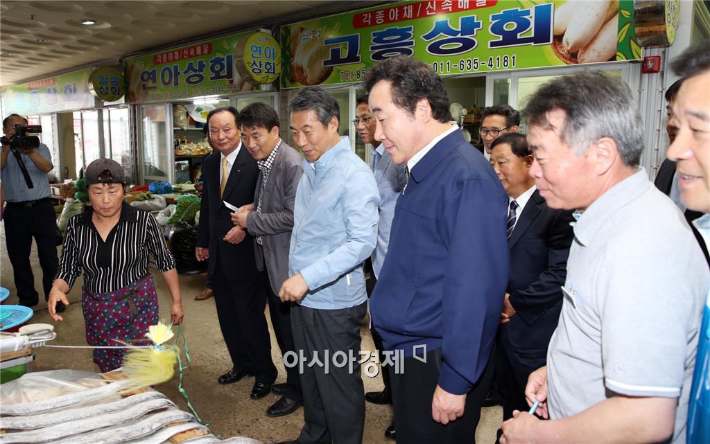 정종섭 행정자치부 장관과 이낙연 전남지사가 26일 오후 중동호흡기증후군(메르스·MERS) 확진환자 발생으로 인해 어려움을 겪고 있는 보성매일시장을 방문, 상인들을 격려하고 있다.사진제공=전남도