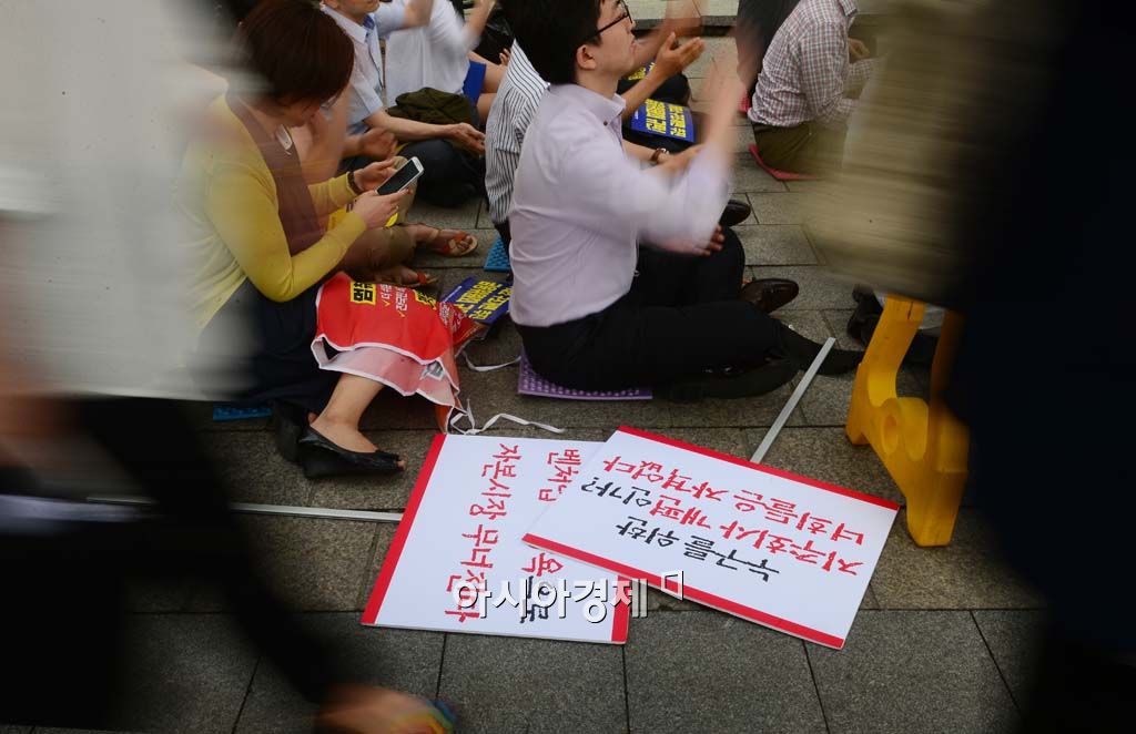 [아시아경제 백소아 기자] 26일 서울 태평로 금융위원회 앞에서 한국거래소 노조원들이 코스닥시장 분리 추진 중단을 촉구하고 있다.백소아 기자 sharp2046@asiae.co.kr<ⓒ세계를 보는 창 경제를 보는 눈, 아시아경제(www.asiae.co.kr) 무단전재 배포금지>