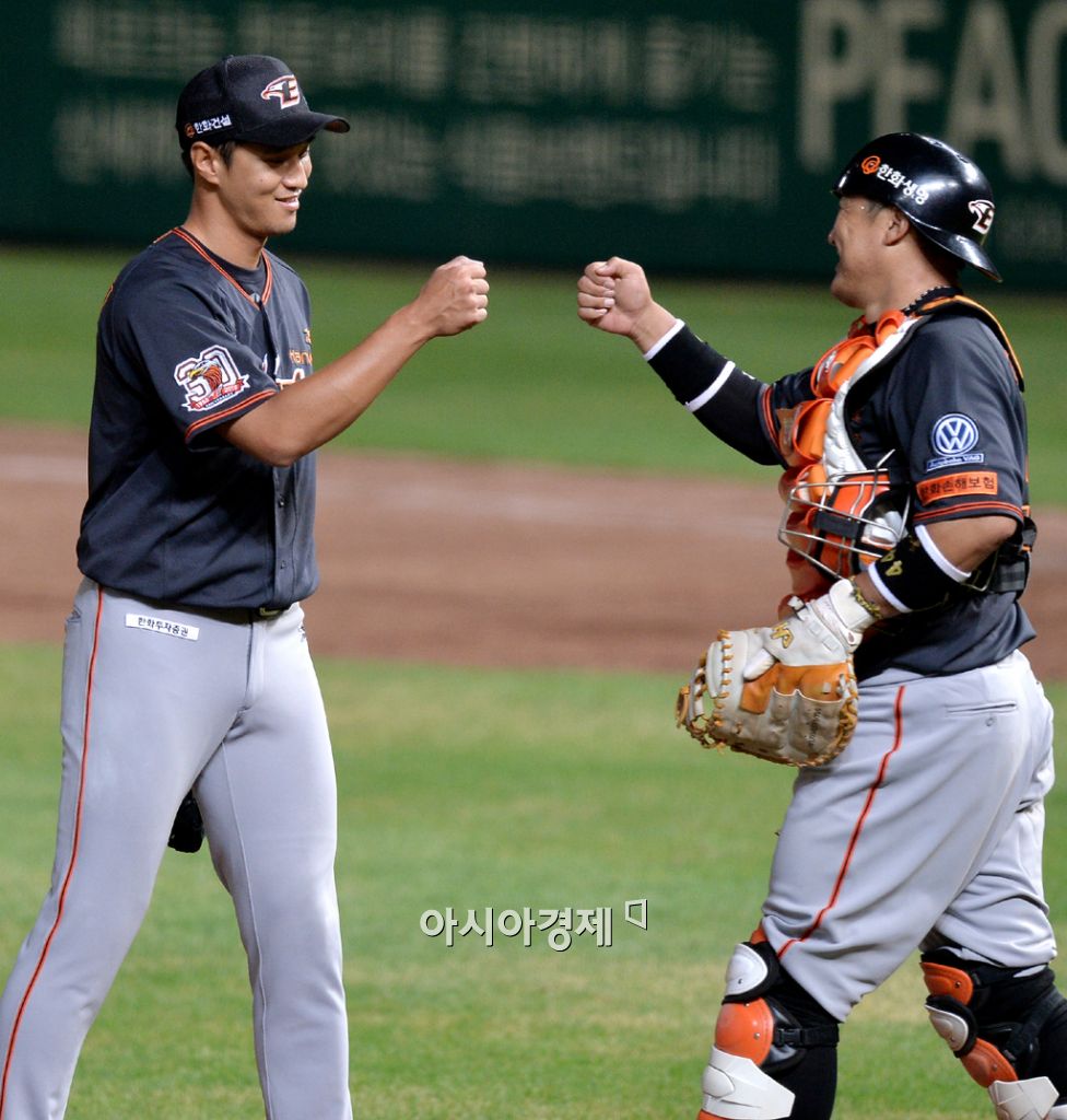 [인천=아시아경제 김현민 기자] 2015 KBO리그 한화 이글스와 SK 와이번스의 경기가 28일 문학야구장에서 열렸다. 9회말 한화 윤규진·조인성 배터리가 6-3 승리를 확정짓고 하이파이브하고 있다. 김현민 기자 kimhyun81@asiae.co.kr<ⓒ세계를 보는 창 경제를 보는 눈, 아시아경제(www.asiae.co.kr) 무단전재 배포금지>