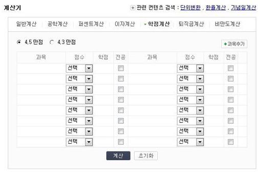 [아시아경제 온라인이슈팀] 국내 대학의 기말고사가 끝난 가운데 대학생들 사이에서 '성적(학점)계산기' 서비스가 인기를 끌고 있다.현재 각종 포털사이트에서는 대학생들의 성적을 계산해주는 학점계산기 서비스를 제공하고 있다. 해당 계산기를 이용하기 위해선 4.5 만점과 4.5 만점(A-점수 포함), 4.3 만점 등 세 가지 유형 중 자신의 학교 학점 제도에 해당하는 것을 선택한 뒤 과목, 점수, 학점 등을 입력하면 된다.특히 이 성적계산기는 대학생뿐 아니라 취업 준비생들이 입사 지원서를 쓸 때에도 유용하게 쓰이고 있다.한편 이 계산기는 성적 계산뿐 아니라 공학계산, 비만도계산, 이자 계산, 퇴직금 계산, 퍼센트 계산 등 다양한 기능을 갖고 있다. 온라인이슈팀 issue@asiae.co.kr<ⓒ세계를 보는 창 경제를 보는 눈, 아시아경제(www.asiae.co.kr) 무단전재 배포금지>