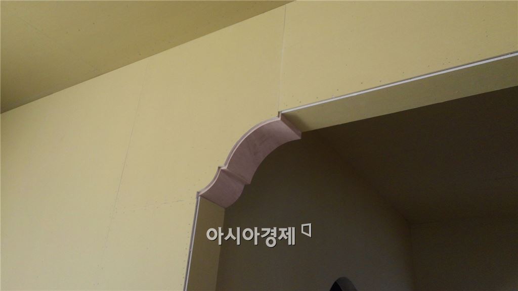 골드색상 시트락브랜드(Sheetrock® Brand)석고보드를 천장과 벽에 시공한 모습