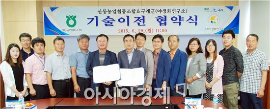 구례군농업기술센터 야생화연구소(소장 정연권)는 지난 6월29일 ‘산수유잼 제조기술’이전 협약식을 가졌다. <br />
