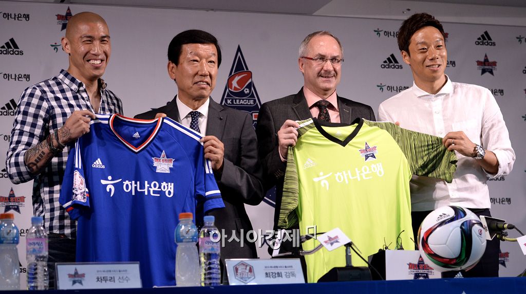 [신문로=아시아경제 김현민 기자] 프로축구 K리그 올스타전 출전선수 발표 기자회견이 2일 서울 신문로 축구회관에서 열렸다. 차두리(왼쪽부터), 최강희 감독, 슈틸리케 감독, 염기훈이 이번 올스타전 유니폼을 공개하고 있다. 김현민 기자 kimhyun81@asiae.co.kr<ⓒ세계를 보는 창 경제를 보는 눈, 아시아경제(www.asiae.co.kr) 무단전재 배포금지>지>