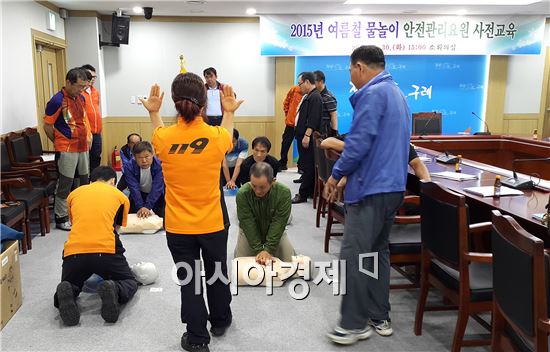 구례군은 본격적인 무더위가 시작되는 7~8월에 물놀이로 인한 사고가 급증할 것으로 예상됨에 따라 지난 6월 30일 구례군청에서 여름철 물놀이 안전관리요원 교육을 실시했다.<br />