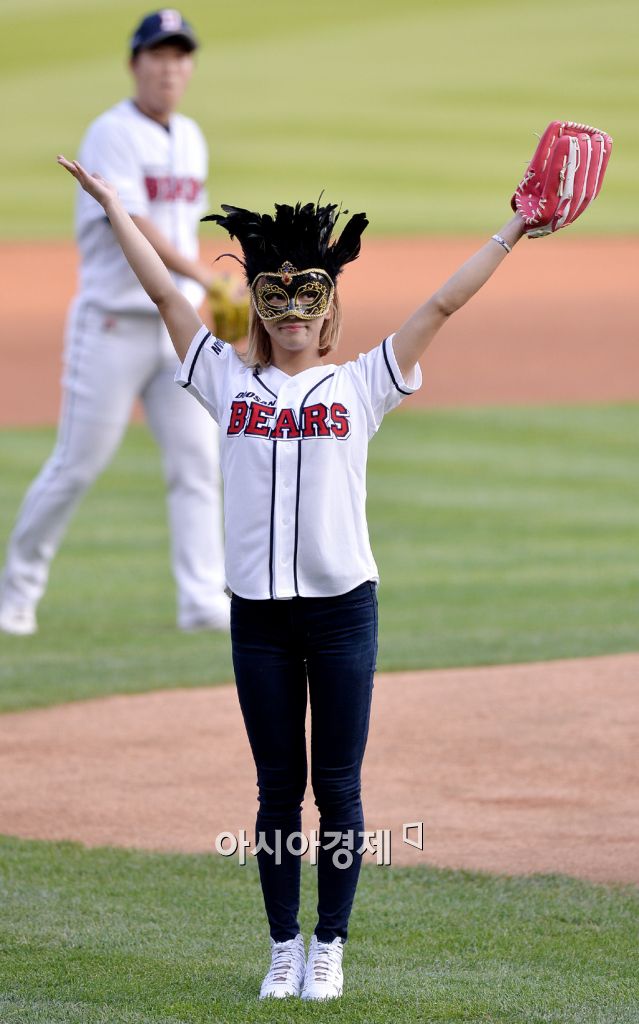 [잠실=아시아경제 김현민 기자] 2015 KBO리그 LG 트윈스와 두산 베어스의 경기가 2일 잠실야구장에서 열렸다. 경기에 앞서 걸그룹 에프엑스 루나가 복면을 쓰고 시구를 하고 있다. 김현민 기자 kimhyun81@asiae.co.kr<ⓒ세계를 보는 창 경제를 보는 눈, 아시아경제(www.asiae.co.kr) 무단전재 배포금지>