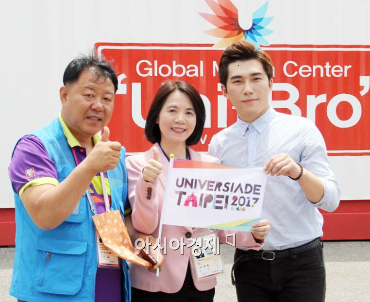 광주U대회 개막식 참석과 차기 개최지인 타이페이를 홍보하기 위해 3일 광주에 도착한 주여방(쩌우리방, 중앙) 타이페이시 부시장 겸 타이페이세계대학운동회조직위원회 위원장이 유니브로 방송국을 방문, 정 철 유니브로 주간(왼쪽)을 만나 2017타이페이U대회 초청의사를 전달했다. <br />