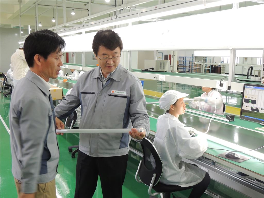 이재형 동부라이텍 대표가 중국 연태법인 형광등 조립라인에서 생산되는 형광등을 살펴보고 있다. (전면 왼쪽에서 두번째)
