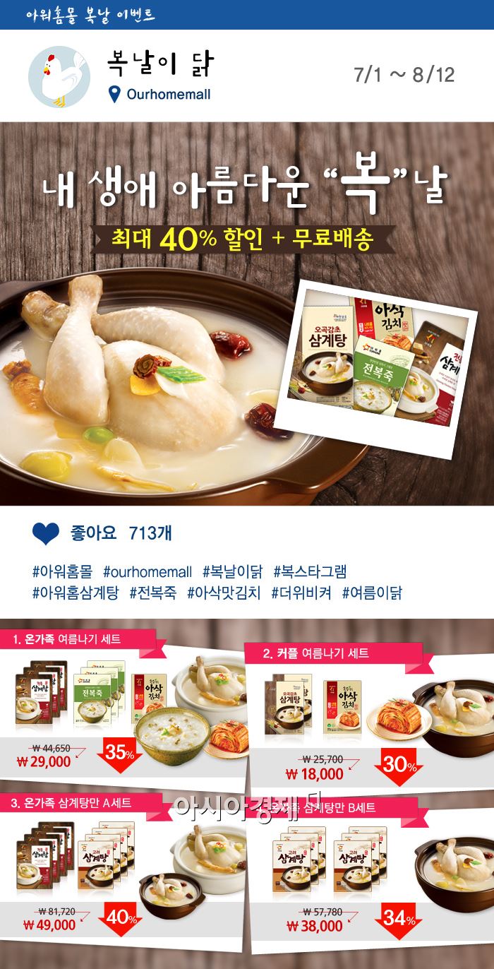 [아시아경제 이광호 기자] 아워홈이 본격적인 여름철을 맞아 다음달 12일까지 보양식을 저렴한 세트로 구성해 판매하는 '내 생에 아름다운 복날' 이벤트를 진행한다고 6일 밝혔다. 이번 이벤트 품목은 가족 단위의 고객들과 커플 단위의 고객들을 위한 세트로 각각 구성됐으며, 선호도에 따라 삼계탕만을 구입할 수 있는 가족 단위의 세트도 추가로 마련됐다.가족 단위의 고객들을 위한 온가족 여름나기 세트는 국내산 영계를 사용하고 은행, 대추, 밤, 인삼 등을 넣어 푹 고은 전통삼계탕과 신선한 전복을 넣어 끓인 영양만점 전복이 그대로 전복죽 각 3팩과 더불어 시중 김치 대비 나트륨 함량이 50% 이상 저감된 웰빙 김치 손수담은 아삭맛김치 1팩으로 알차게 구성됏으며, 가격은 35% 할인된 2만9000원이다.커플들이 오붓하게 즐길 수 있는 커플 여름나기 세트는 감초추출물과 몸에 좋은 찹쌀, 현미, 흑미, 수삼, 율무 등을 넣어 더욱 진하고 부드러운 맛이 일품인 오곡감초삼계탕 2팩과 손수담은 아삭맛김치 1팩으로 이뤄져 있으며, 30% 할인된 가격인 1만8000원에 만나볼 수 있다.또 좀 더 든든하고 알찬 몸보신을 원하는 고객들을 위해 삼계탕으로만 구성된 세트도 판매 중이다. 전통삼계탕 4팩, 고려삼계탕 4팩으로 구성된 온가족 삼계탕만 A세트는 40% 할인된 가격인 4만9000원에, 고려삼계탕 6팩으로 구성된 온가족 삼계탕만 B세트는 34% 할인된 가격인 3만8000원에 즐길 수 있다.이광호 기자 kwang@asiae.co.kr<ⓒ세계를 보는 창 경제를 보는 눈, 아시아경제(www.asiae.co.kr) 무단전재 배포금지>