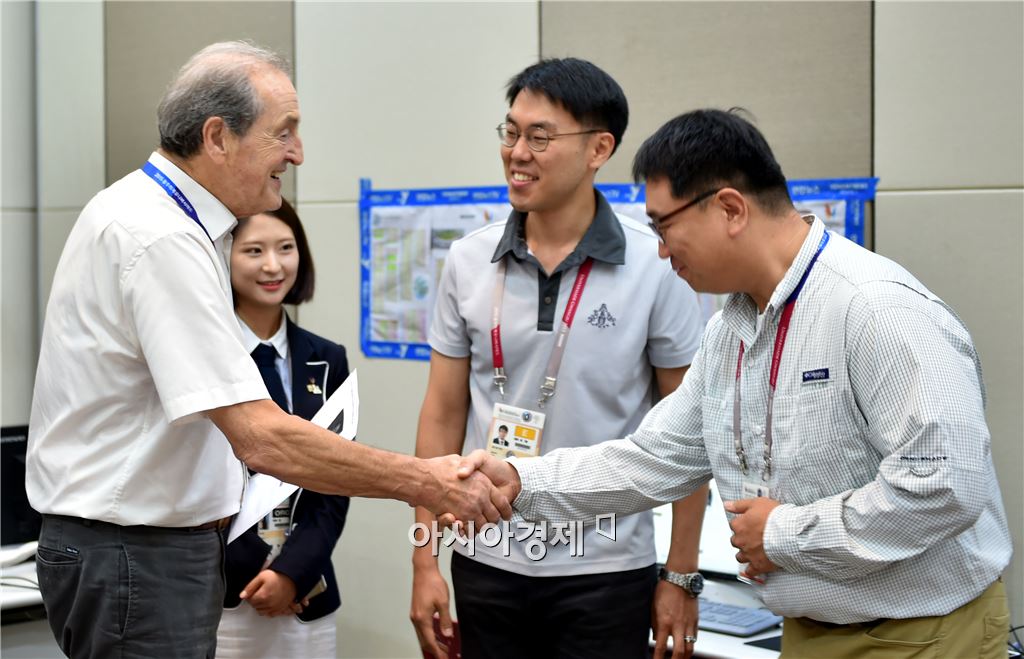 6일 오전 광주 김대중컨벤션센터에 자리한 메인미디어센터에서 끌로드 루이 갈리앙 국제대학스포츠연맹(FISU) 회장이 조직위원회 관계자와 악수를 하고있다. 사진제공=광주U대회조직위