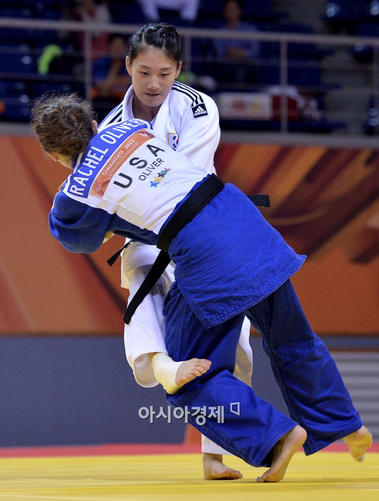 [광주=아시아경제 김현민 기자] 한국 김잔디(백색 도복)가 6일 광주 염주빛고을체육관에서 열린 2015 광주하계유니버시아드 유도 여자 -57kg급 패자부활전에서 미국의 라첼 올리버를 상대로 모두걸기를 시도하고 있다.김현민 기자 kimhyun81@asiae.co.kr<ⓒ세계를 보는 창 경제를 보는 눈, 아시아경제(www.asiae.co.kr) 무단전재 배포금지>