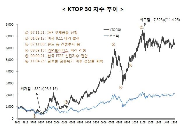 [아시아경제 이현우 기자]"새로운 한국 대표지수로 탄생할 KTOP30 지수는 기준시점인 지난 1996년부터 약 20년간 코스피대비 3배 높은 상승률을 기록했으며 지난 주말 기준으로 소급하면 6244포인트에 올라있다."박영석 주가지수운영위원회 위원장은 6일 한국거래소 서울사옥에서 열린 KTOP30지수 발표 기자회견에서 "답답한 박스피만 보던 국내 투자자들이 우상향하는 KTOP30 지수를 보면 한국자본시장의 성장성에 보다 신뢰감을 얻을 수 있을 것"이라며 이와같이 말했다. KTOP30 지수는 지난해 11월 금융위원회의 주식시장 발전방안의 하나로 한국형 다우지수 개발을 추진키로 하면서 개발이 시작된 한국의 새로운 대표지수다. 오는 13일부터 지수가 산출될 예정이다. 미국의 다우지수를 밴치마킹해 30개 시장 우량종목으로 구성됐다. 박 위원장은 "종목 선정에 있어서 경제대표성과 시장대표성, 투자자접근성, 지속성장성, 지수 영향 등 5개 부문을 심사해 선정했다"며 "종목 수가 너무 많을 경우 기존 코스피200지수와 차별성을 두기 어렵고 다우지수를 밴치마킹한다는 뜻에서 종목 수는 30개로 제한했다"고 밝혔다. KTOP30 지수는 앞서 나온 코스피나 코스피200 지수와 같은 정기 종목변경이 없어 기업공개(IPO)를 통해 신규로 대형종목이 시장에 상장될 경우라도 곧바로 구성종목이 변경되지는 않는다. 박 위원장은 "종목에 대한 정기검토는 매 9월에 할 예정"이라며 "대형종목이 만약 신규 상장한다고 해도 바로 지수에 편입되지는 않고 주가지수운영위원회에서 좀더 신중하게 검토할 계획"이라고 말했다. 종목 선정 과정에서 논란의 대상이 됐던 삼성전자의 경우에는 조정계수(0.5)를 넣어 지수에 포함됐다. 박 위원장은 "주가 50만원 이하 종목을 편입한다는 원칙은 고수하지만 국내 산업에 지대한 영향을 끼치는 삼성전자를 빼고는 글로벌 지수로 대표성을 가지기 어렵다는 판단이 앞섰다"며 "지수편입 시 50만원이 기준이라 논의결과 0.5 정도의 조정계수를 넣는게 적당하다고 판단됐고 네이버(NAVER)의 경우에는 50만원은 넘지만 조정계수까지 넣을 수준은 아니라는 판단하에 그대로 포함시켰다"고 말했다.이현우 기자 knos84@asiae.co.kr<ⓒ세계를 보는 창 경제를 보는 눈, 아시아경제(www.asiae.co.kr) 무단전재 배포금지>