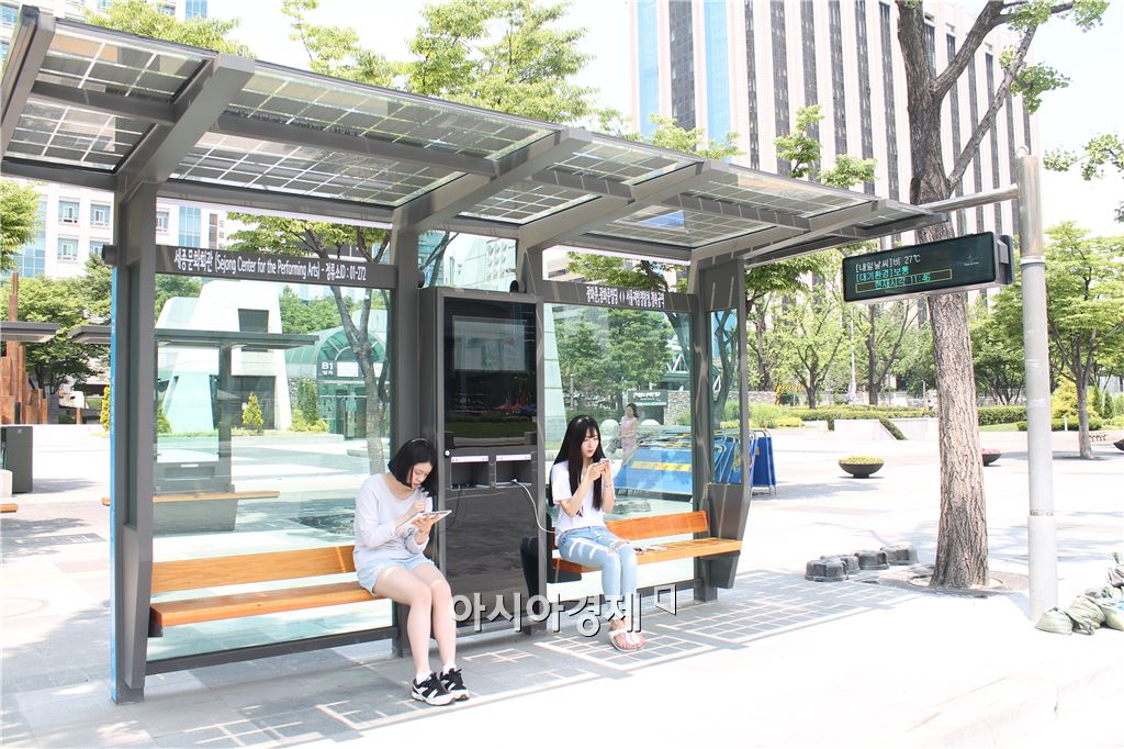 ▲태양광 휴대전화 충전기가 설치된 세종문화회관 앞 버스 정류장 (사진=서울시)