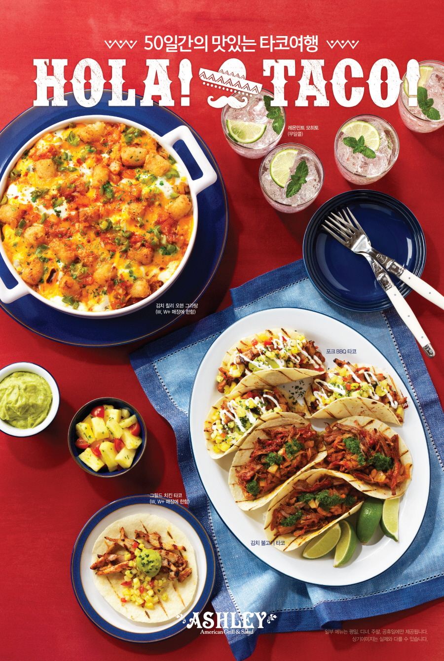 [아시아경제 최서연 기자] 애슐리가 본격적인 여름을 맞아 7일 ‘50일 간의 맛있는 타코 여행’ 콘셉트의 신메뉴 ‘올라 타코(HOLA TACO)’를 출시했다. 이번 여름 신메뉴의 가장 큰 특징은 입맛에 따라 직접 만들어 먹는 타코 DIY(직접 만들기) 존을 강화한 것이다. 타코는 얇게 편 밀가루 반죽을 살짝 구워낸 토르티야에 취향에 따라 다양한 토핑과 소스를 더해 즐기는 멕시코 음식이다. 애슐리는 타코 토핑으로 쫄깃하고 진한 맛을 느낄 수 있는 ‘포크 BBQ’와 ‘김치 프라이’, ‘그릴드 치킨’ 등을 비롯해 구운 채소를 제공한다. 소스로는 아르헨티나식으로 만든 ‘향긋한 깻잎 페스토’를 비롯해 ‘갈릭 사워크림소스’, ‘파인애플 살사소스’ 등 4종을 준비했다.애슐리 W와 애슐리 W+에서는 달콤한 소스를 바른 ‘애플허니 폭립’과 고추장 베이스로 매콤한 맛을 더한 ‘스파이시 바비큐 폭립’ 등 은은한 불 맛을 느낄 수 있는 그릴 요리 2종을 만나볼 수 있다. ‘김치 칠리 오븐 그라탕’은 나초크림소스로 버무린 해시포테이토에 매콤한 김치로 느끼함을 잡아낸 것이 특징이다.메인요리에 곁들일 수 있는 디저트와 음료도 다채롭다. 디저트로는 아이스크림을 얹어 먹으면 더욱 맛있는 ‘레드빈 크레페’와 달콤한 파인애플 잼 위에 바삭한 크럼블을 올려 구워낸 ‘파인애플 크럼블’이 제공된다. 무알코올 칵테일 ‘레몬민트 모히토’는 향긋한 스피아민트로 상쾌함을 더해 이국적인 정취를 한껏 만끽할 수 있다. 한편 애슐리는 여름 신메뉴 출시를 기념해 온라인 이벤트를 실시한다. 8월26일까지 진행하는 ‘여름 시즌 신메뉴 블로그 시식평 이벤트’를 통해 여름 신메뉴를 맛본 뒤 공식 블로그(blog.naver.com/your_ashley)에 시식평을 남기면 우수 작성자 25명을 선발해 1인 식사권을 증정한다. 이달 16일부터 시작하는 ‘나도 애슐리 먹방 STAR!’ 이벤트는 애슐리 신메뉴를 맛있게 먹는 동영상을 촬영해 자신의 페이스북에 업로드한 뒤 해당 URL을 8월2일까지 공식 홈페이지(www.myashley.co.kr) 공지사항에 남기면 참여가 완료된다. 우수 작성자 5명에게 1인 식사권을 제공하며 8월7일 홈페이지에서 당첨여부를 확인할 수 있다.최서연 기자 christine89@asiae.co.kr<ⓒ세계를 보는 창 경제를 보는 눈, 아시아경제(www.asiae.co.kr) 무단전재 배포금지>