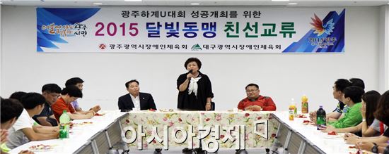 광주시장애인체육회는 7일 '2015 광주하계U대회' 성공개최와 영·호남 동서화합 및 우호증진을 위한 `2015 달빛(광주-대구)동맹 친선교류`를 가졌다. <br />