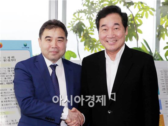 이낙연 전라남도지사는 7일 오전 집무실에서 대표단을 이끌고 전남을 방문한 코자니야조브 세릭(Kozhaniyazov Serik) 카자흐스탄 크즐오르다주 부주지사와 간담회를 갖고 양 지역 우호교류협력 방안에 대해 의견을 나눴다. 사진제공=전남도<br />