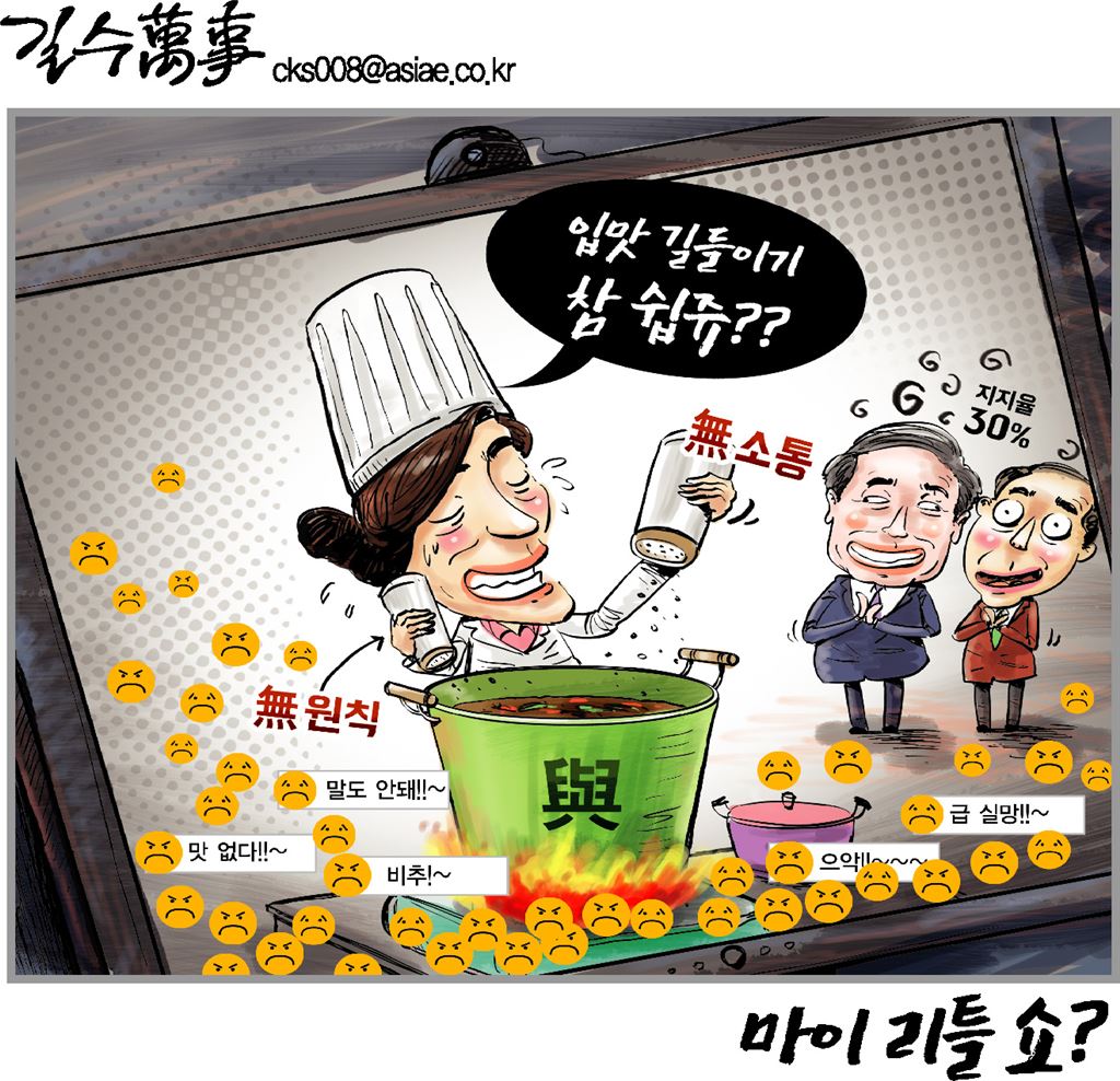 요즘 '슈가보이' 백종원이 대한민국 핫 이슈입니다.자기만의 철학과 친근함으로 시청자들을 TV 앞으로 불러 모으고 있습니다.반면에 박근혜 대통령은 자신의 뜻대로 유승민 전 새누리당 원내대표를 밀어내고,자기만의 고집과 원칙으로 불통을 야기시키고 있는데요.2년 남은 임기를 제대로 이끌어 갈 수 있을지 걱정만 앞서가네요.최길수 기자 cks008@asiae.co.kr<ⓒ세계를 보는 창 경제를 보는 눈, 아시아경제(www.asiae.co.kr) 무단전재 배포금지>