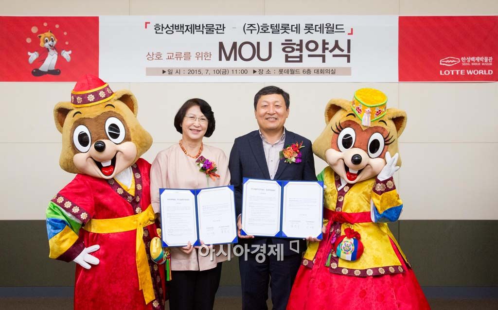 10일 서울 송파구 롯데월드 웰빙센터에서 박동기 롯데월드 대표(오른쪽)와 이인숙 한성백제박물관장(왼쪽)이 박물관 학술 정보 연계 프로그램 개발 및 증진을 위한 협약을 체결한 후 기념사진 촬영을 하고 있다. 이날 박 대표는 "이번 협약식을 통해 양 기관의 상호 발전과 이익을 도모할 수 있기를 기대한다"며 "앞으로도 박물관을 찾는 관람객에게 보다 유익하고 즐거운 관람서비스가 제공될 수 있도록 많은 박물관과 교류를 넓혀 가겠다"고 밝혔다.<ⓒ세계를 보는 창 경제를 보는 눈, 아시아경제(www.asiae.co.kr) 무단전재 배포금지>