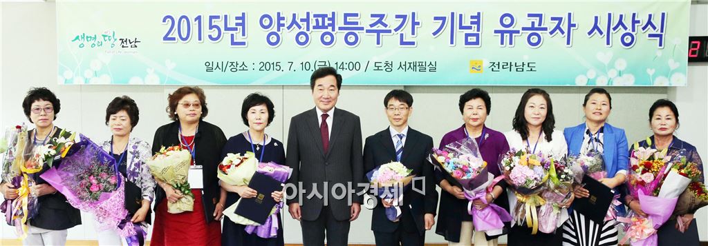 이낙연 도지사가 10일 오후 양성평등주간을 맞아 도청 서재필실에서 열린 ‘2015년 양성평등주간 기념 유공자 시상식'에 참석, 다양한 분야에서 여성의 권익증진 및 양성평등사회 실현에 기여한 유공자에 대한 전남지사 표창장을 수여한 뒤 기념촬영을 하고 있다. 사진제공=전남도