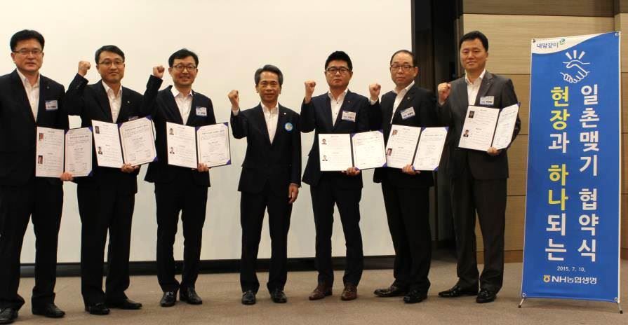김용복 농협생명 대표(왼쪽 네번째)가 '현장과 하나되는 일촌맺기 협약식'에 참석해 본부 및 지점 직원들과 기념촬영을 하고 있다.