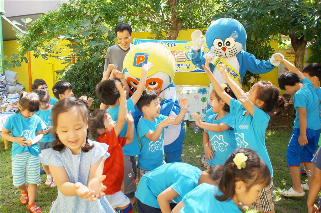 [참좋은 어린이집 개방의 날 행사에서 학부모들과 교사들이 애니메이션 캐릭터 분장으로 놀아주자 원아들이 신명나게 뛰고 있다.]
