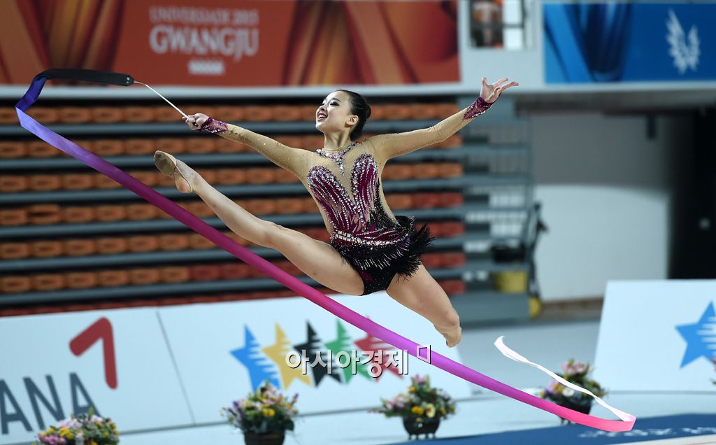 [광주=아시아경제 김현민 기자] '체조 요정' 손연재가 13일 광주여대 유니버시아드체육관에서 열린 2015 광주하계유니버시아드 리듬체조 개인 종목별 결승에서 리본 연기를 하고있다.김현민 기자 kimhyun81@asiae.co.kr<ⓒ세계를 보는 창 경제를 보는 눈, 아시아경제(www.asiae.co.kr) 무단전재 배포금지>