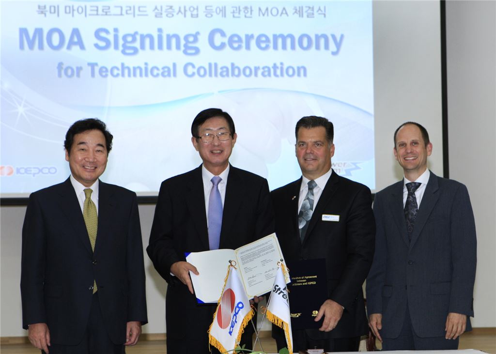 한국전력은 13일 캐나다 파워스트림사와 마이크로그리드 공동 구축 등에 대한 합의각서를 체결했다. 사진 왼쪽부터 이낙연 전남도지사, 조환익 한전 사장, 브라이언 벤츠 파워스트림사 CEO, 에릭 월쉬 주한캐나다대사.