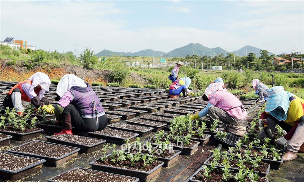 장맛비가 그친 14일 함평군농업기술센터 인근에서 아낙네들이 올해 국향대전에서 사용할 국화를 논에 이식하면서 손길이 분주한다. 올해 국향대전에는 다른 국화축제에서 볼 수 없는 신품종을 선보일 계획이다. 사진제공=함평군