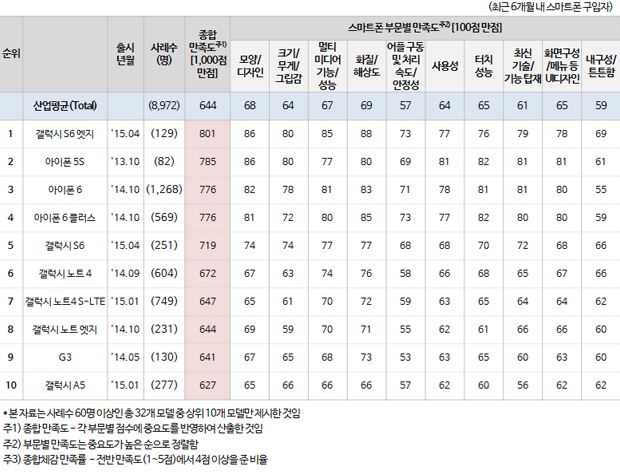 [아시아경제 강희종 기자]갤럭시S6에 대한 국내 소비자들의 만족도가 애플 아이폰을 뛰어넘었다. 14일 소비자평가 전문 리서치 기관인 컨슈머인사이트(대표 김진국)는 최근 6개월(2014년 10월~2015년 4월)간 스마트폰을 구입한 소비자 8972명을 대상으로 스마트폰에 대한 설문 조사를 실시한 결과를 발표했다.이 조사에 따르면 삼성전자 갤럭시S6엣지는 801점을 받아 1위를 차지했다. 컨슈머인사이트 소비자 만족도 조사에서 국내 스마트폰이 아이폰보다 높은 점수를 받으며 1위에 오른 것은 이번이 처음이다.컨슈머인사이트는 "이는 갤럭시 S6 엣지에 아이폰과는 확연히 구별되는 특장점이 있고, 그것이 소비자에게 어필했기 때문"이라며 "멀티미디어 기능/성능, 화질/해상도에서 아이폰을 확실히 앞서고, 모양/디자인, 크기/무게/그립감에서 경쟁력이 있었기 때문"이라고 분석했다.2위는 출시한 지 1년 6개월된 아이폰5S로 785점을 받았다. 다음으로는 아이폰 6와 아이폰 6플러스가 766점으로 나란히 3-4위에 올랐고, 갤럭시 S6(719점)가 5위를 차지했다.