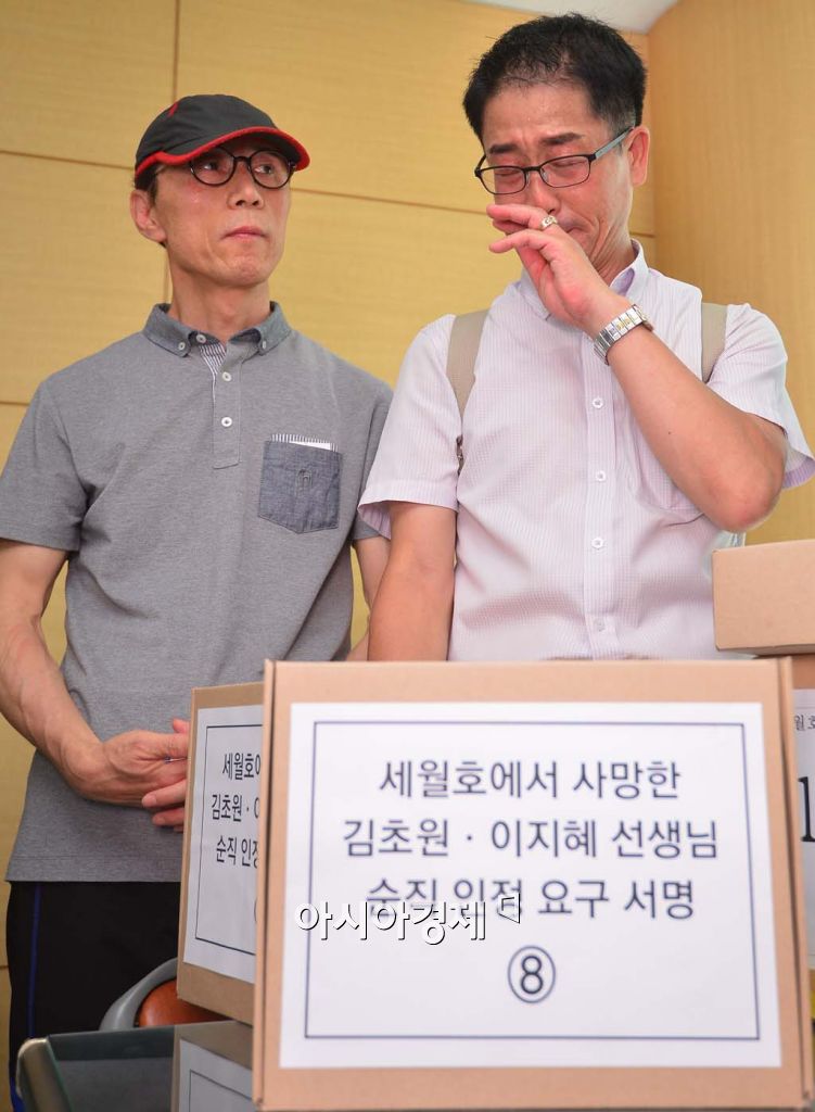 [아시아경제 백소아 기자] 14일 서울 세종로 정부서울청사 접견실에서 세월호 참사로 희생된 故김초원 선생님의 아버지 김성욱씨(오른쪽)가 김초원·이지혜 선생님 순직 인정 요구 서명서를 앞에 두고 눈물을 흘리고 있다.백소아 기자 sharp2046@asiae.co.kr<ⓒ세계를 보는 창 경제를 보는 눈, 아시아경제(www.asiae.co.kr) 무단전재 배포금지>