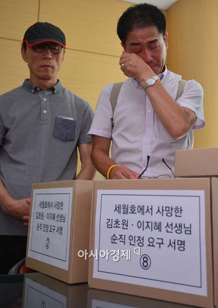 [아시아경제 백소아 기자] 14일 서울 세종로 정부서울청사 접견실에서 세월호 참사로 희생된 故김초원 선생님의 아버지 김성욱씨(오른쪽)가 김초원·이지혜 선생님 순직 인정 요구 서명서를 앞에 두고 눈물을 흘리고 있다.백소아 기자 sharp2046@asiae.co.kr<ⓒ세계를 보는 창 경제를 보는 눈, 아시아경제(www.asiae.co.kr) 무단전재 배포금지>